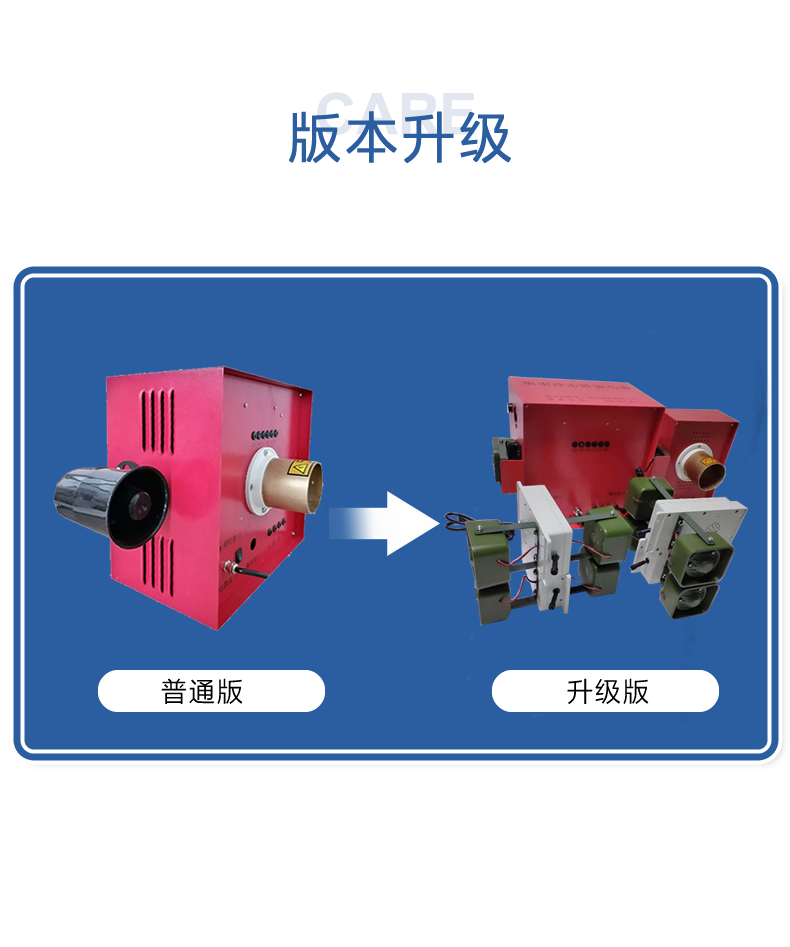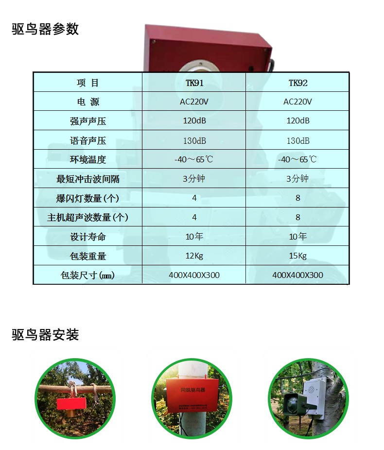 TK90系列集束冲击波驱鸟器是我公司研发设计的四级驱鸟产品,此驱鸟器是集电子炮技术、电子爆鸣技术、鸟天敌声、集束强声、强闪光等技术为一体,制造的综合型驱鸟装置,设备可产生集束式强声声压,制造高声压范围,使鸟类在此范围内耳膜无法承受,从而达到隔离鸟的目的。