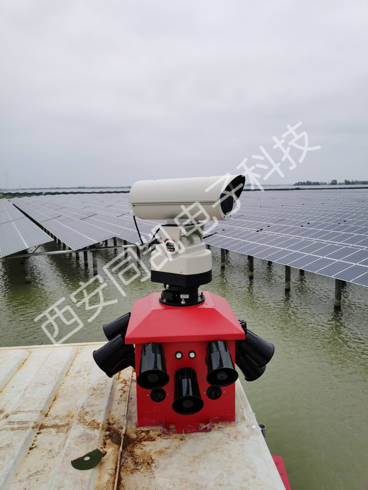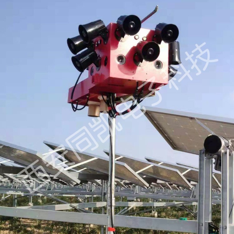 该是一款针对光伏电力鸟害研发的智能综合驱鸟器,主要通过冲击炮、集束强声、滚超声波、次声波、语音等技术解决光伏电站大面积驱鸟难题,其工作时各声源在防区内形成一定高声压范围,使鸟类进入该区域时耳膜无法承受,自动飞离防护区域,其有效驱赶直径200米,单台覆盖面积约50亩地,据实测其能有效驱赶光伏电站内白头翁、白鹭、喜鹊、乌鸦、麻雀等大小型灵性鸟类,小区域净空效果显著。